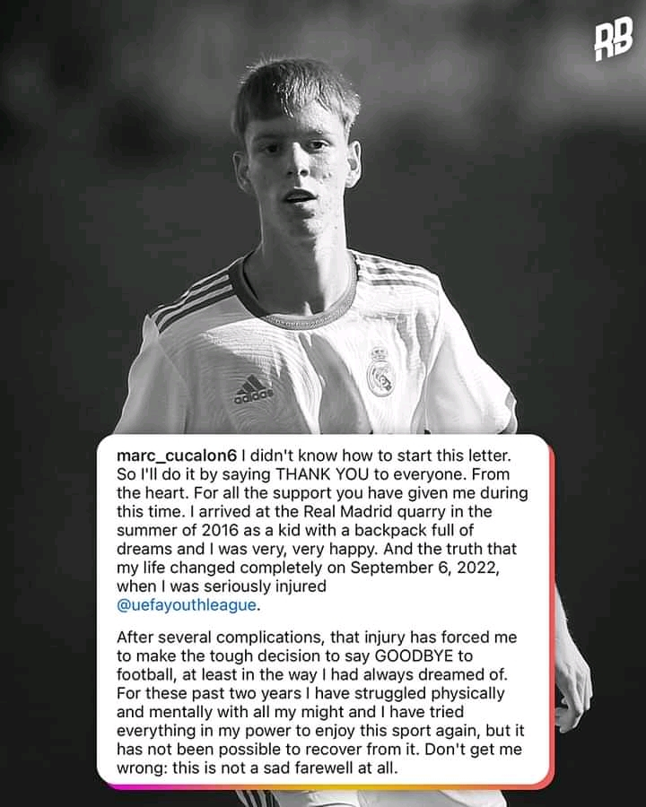 This is heart-breaking… Real Madrid academy midfielder Marc Cucalón has completely retired from football at just 19 years old after suffering a serious injury over the past 2 years.