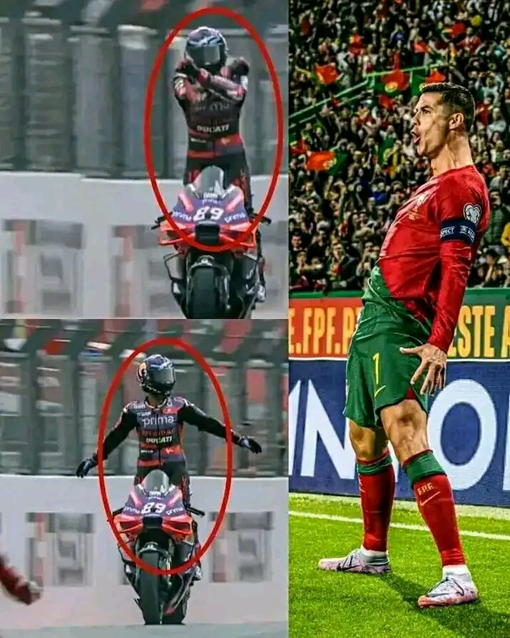 A motor rider with the siuuuu celebration on the bike
