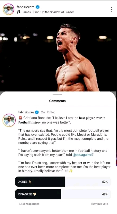 Poll conducted by Fabrizio Romano, Messi's biggest fan... Check the results for yourself.. Thank God it's not Big Bakanja who conducted the poll... CR7 is the undisputed GOAT 🐐.. Crying fanbase can you continue the crying now in the comment section? How can you win a world Cup and still crying?